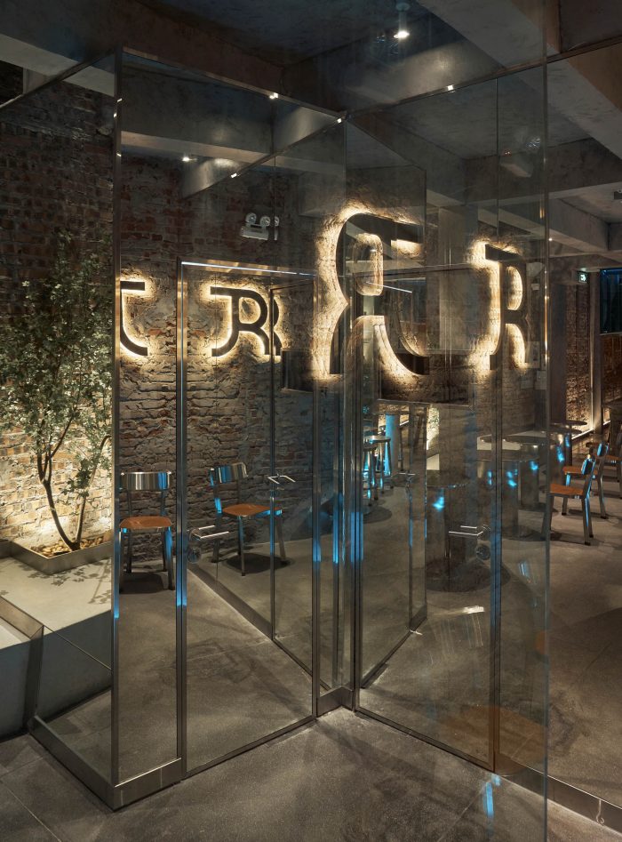 一楼的核心是开放的咖啡柜台,它是由透明玻璃砖和不锈钢制成。在柜台上方,有一个由蓝色玻璃和不锈钢制成的对角线矩形块,与冷冻运动产生强烈的共鸣。我们把两个侧墙的饰面砂浆层也去掉了,多放了一层斜面玻璃,以配合斜面的柜台天花板。由于宽度的劣势,我们想增加建筑的原始高度,我们通过额外放置一层镜子,使其感觉更高更大气。为了完成它,选择了黄色的灯光层作为主灯,但我们在柜台天花板内增加了一层蓝色的灯光,以创造颜色效果和冰山的感觉。