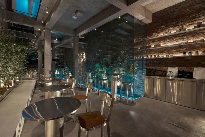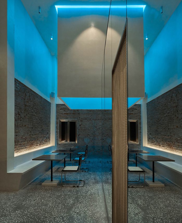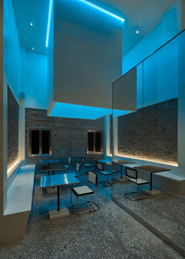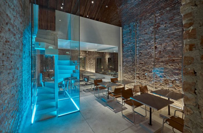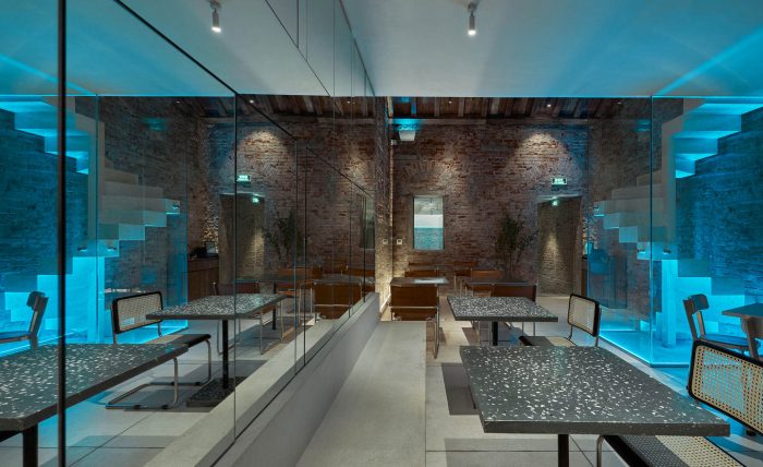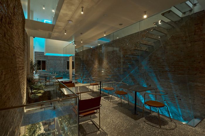 至于旧的砖墙,一部分被保留下来,另一部分则与米白色效果的墙面相结合。傍晚时分,整个空间被一种色调为蓝色的LED灯光所覆盖,反映出冰山的感觉--与底层相同。由于需要扩大面积和所需的座位数,我们将结构从两层改为三层,加上交织的夹层。天花板被推高,为自然光创造空间,以克服一开始的光线不足问题。