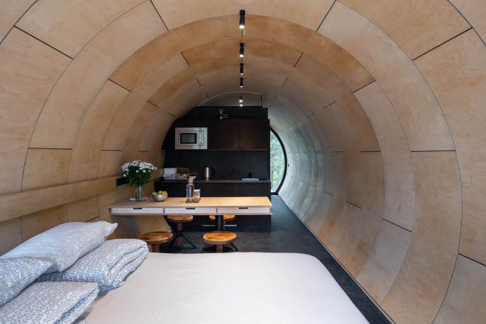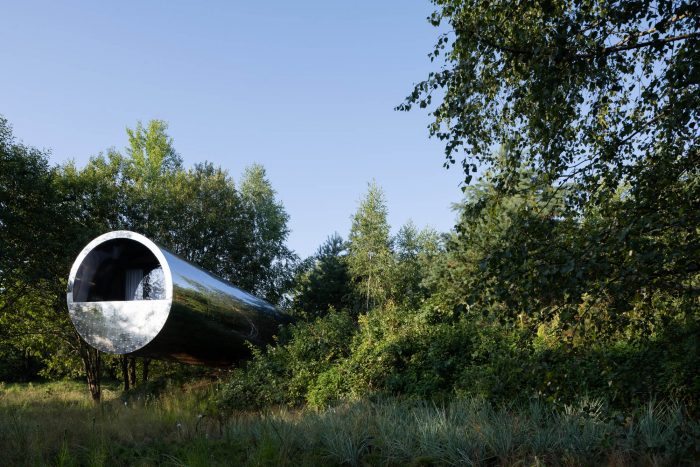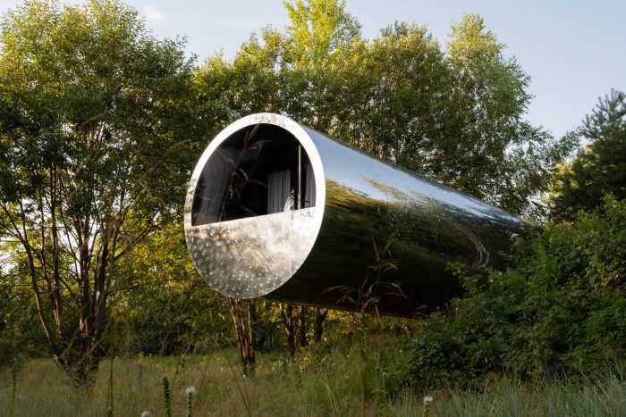 The house is made in the shape of "a pipe" with a diameter of 3.5 meters and a length of 12 meters. It is placed on the relief with a difference in height, due to which the structure is literally "hanging" in the air. To create it, complex engineering techniques were used that are usually used in shipbuilding. For example, the frame of the building is formed from supporting ribs like a body of a ship, and an impressive weight of about 12 tons is kept in balance by only six bolts.