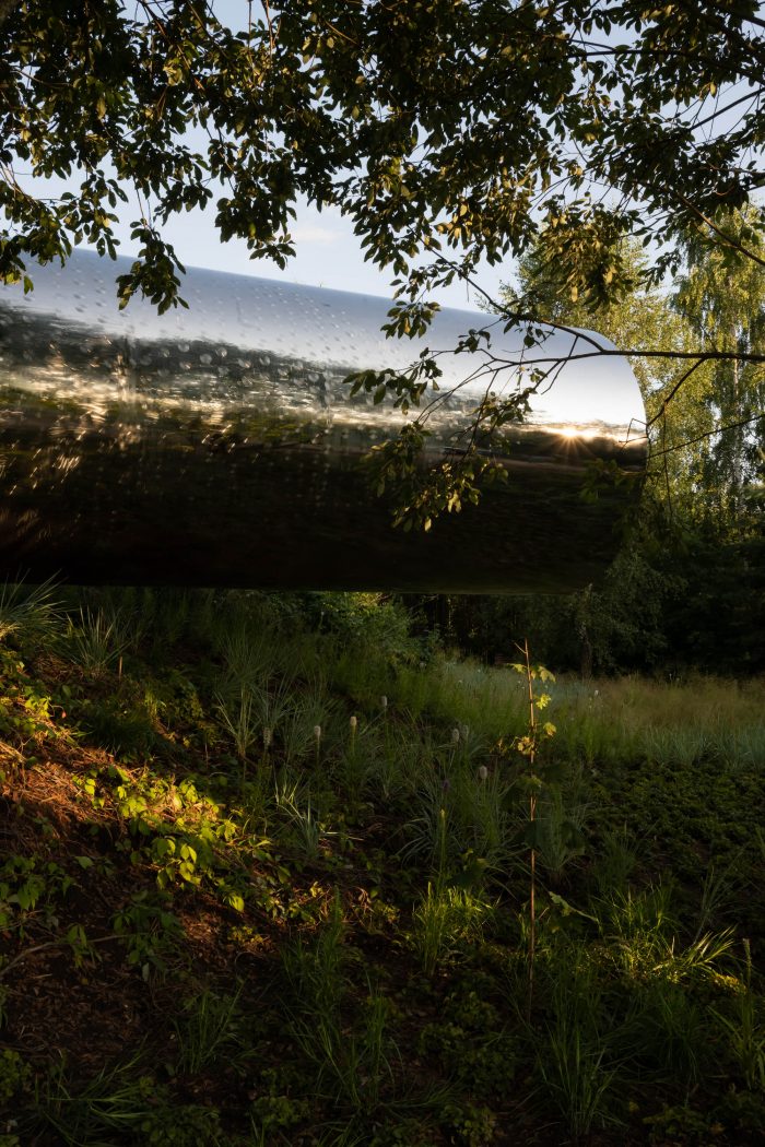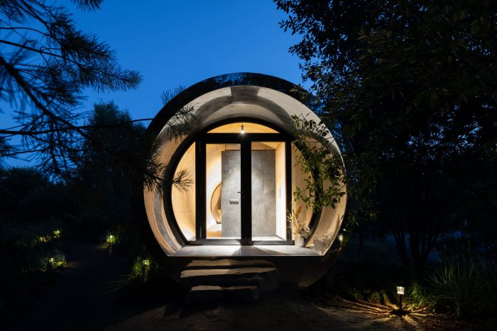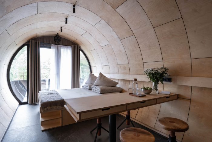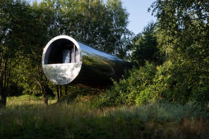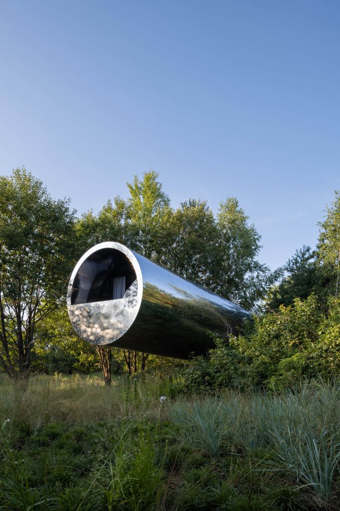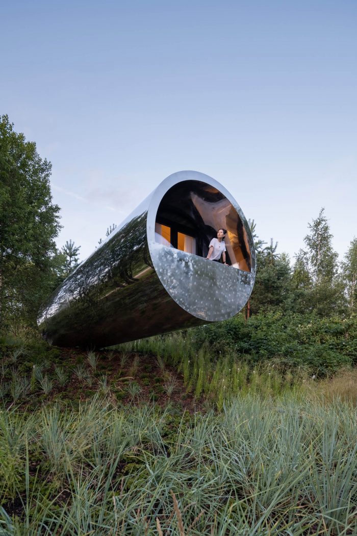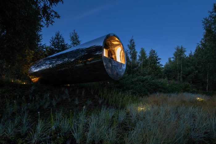 One of the main features of the project is the seamless cladding made of a 4 mm stainless steel sheet. Underneath there is a system for diverting the drum sound of rain. In general, this is a full-fledged residential building with all modern conveniences. You can live inside - stay overnight, cook dinner and take a shower. The interior is finished in a modern style using wood and metal, and the room is equipped with everything necessary for a comfortable stay.