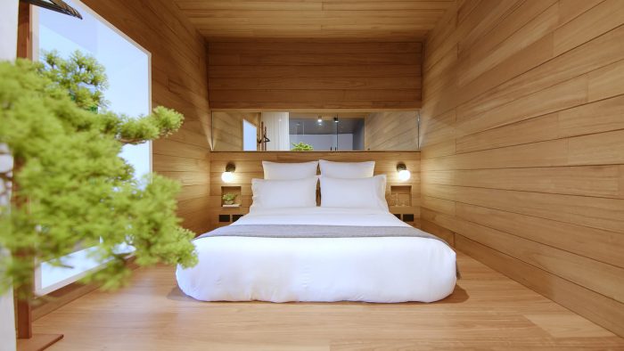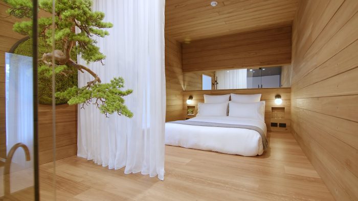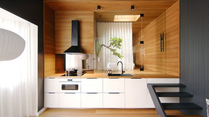 The kitchen. The kitchen bench blends seamlessly into the bedroom platform. In entering the bedroom, there is a zen garden with a bonsai tree coming out of the wall. The garden sits behind a glass wall that connects with the kitchen. Zero maintenance Bonsai Tree from lifelike materials, strategically placed under the skylight, so around 12-1 everyday natural sunlight comes into the space and shines on the Bonsai. On the other side of the garden is a sheer curtain that allows light to pass through to the bedroom but also provides privacy.