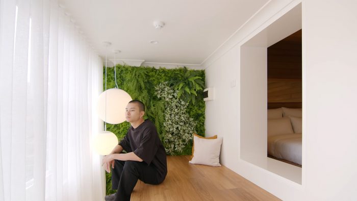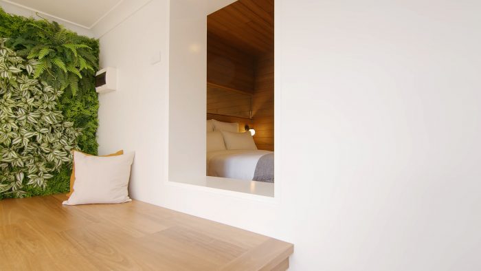 Beside the mattress, two small custom niches act as bedside tables, above which are two wall lights for night time ambiance. Next to the bedroom is a meditation space. The entry to the meditation space is through a small window opening inspired by traditional Japanese teahouses. The architects intentionally lowered the ceiling and raised the platform to compress the vertical space directing you to sit on the platform once passed through the opening. Here, the architects added another zero maintenance vertical garden. In this room, you can detach from work and stress.