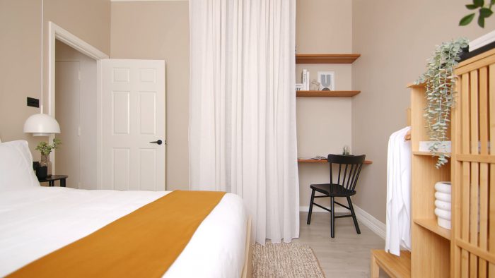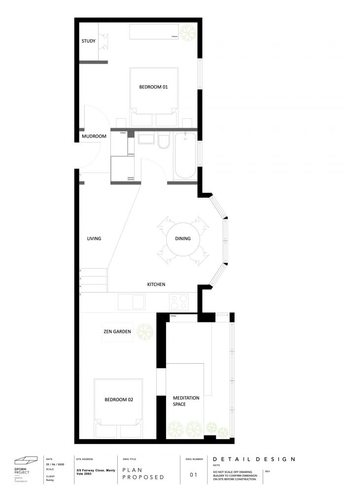 Before the redesign by Dan Yang from Dform Projects, the floor plan was not particularly well thought out… not a lot of that gorgeous Manly sunshine made its way into the 52sqm apartment. This, alongside the complex plumbing, created a challenge for the architects that required a creative design solution. The architects demolished the bedroom wall to allow natural light to penetrate deeper into the apartment and moved the bathroom away from the entrance. They also opened up the kitchen, living, and dining spaces, combining them into a larger, overlapping area.