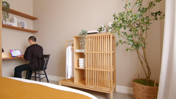 The meditation space. There is roughly 15m3 of storage space underneath the bedroom and the meditation room which can be used for storing bulky and seasonal items. The Second bedroom is hidden on the other side of the main entrance. When the door to the bedroom opens, the timber cladding partition wall becomes an extension of the timber Genkan. A small but practical study is hidden behind the foyer extension.