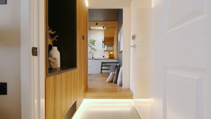 The entrance. A floating platform was created in the living area creating a Tatami-style living area that also leads to the bedroom. In the kitchen, matte black elements meet bronze mirrors for the kitchen splashback. The architects decided a bronze mirror in this wooden context can create a softer ambient reflection of the surrounding.