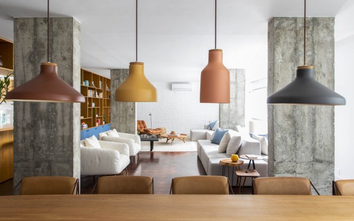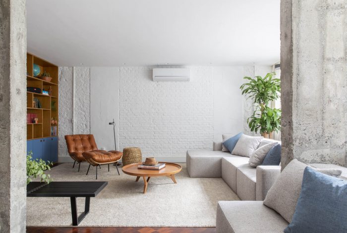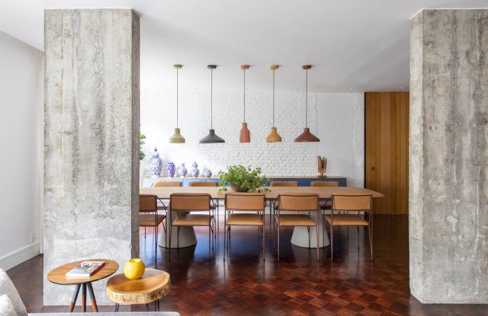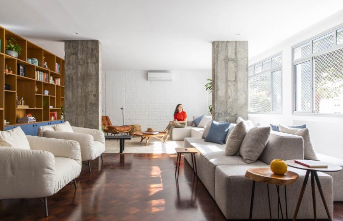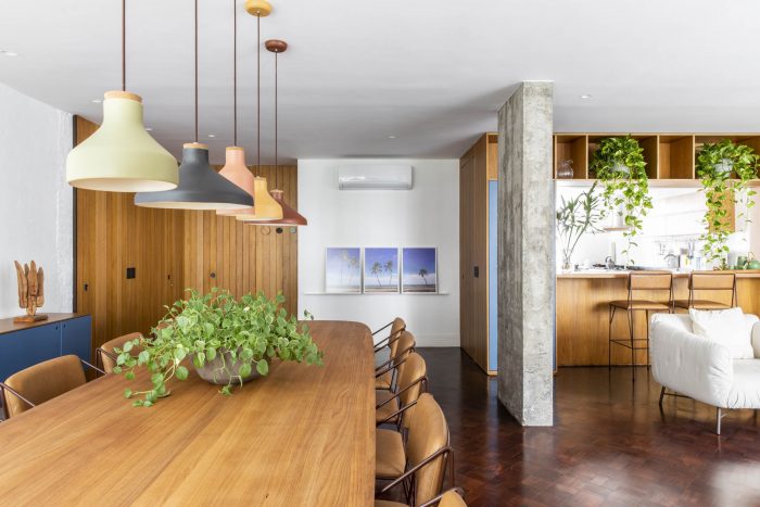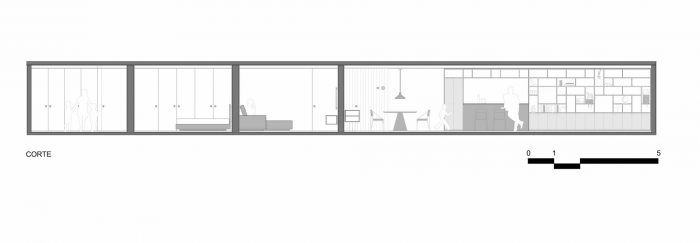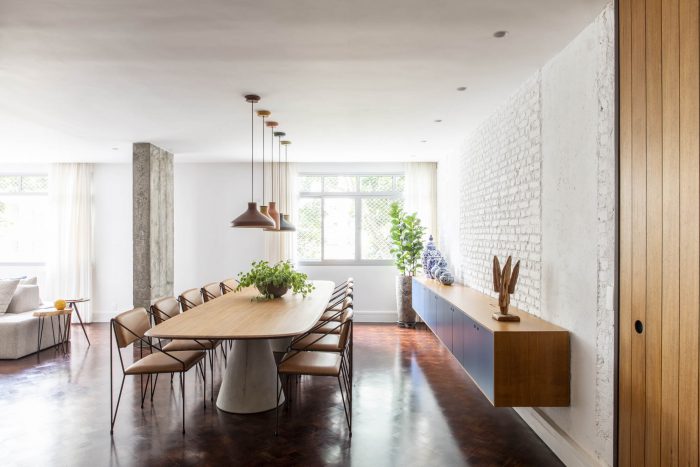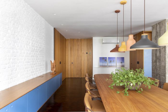 Part of the existing structure, previously hidden by walls, is now present in the ensemble. The wall opposite the windows, partly pre-existing and partly newly built, has been lined with an extensive shelving unit, which is present in all three ambiences of the space: family room, living room and dining room. There is also an opening that connects to the kitchen, which was preserved during construction, bringing more ventilation and natural lighting to it from the windows at the opposite end of the unit.