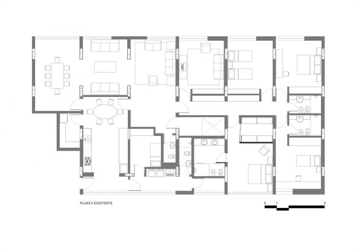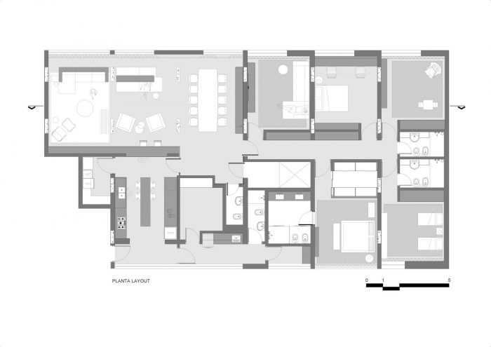 在对现有单元和客户需求进行分析后,项目主要关注的是物业的主要社交区域。通过观察公寓原有的植物,我们发现迫切需要统一客厅和餐厅,因为客厅和餐厅是部分隔断的。厨房的布局也有问题,在比例和流通上呈现出明显的问题。就像在逻辑游戏中,分界线几乎没有移动,结果空间变得非常有趣。因此,项目的前提被确定下来。