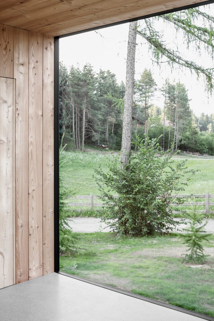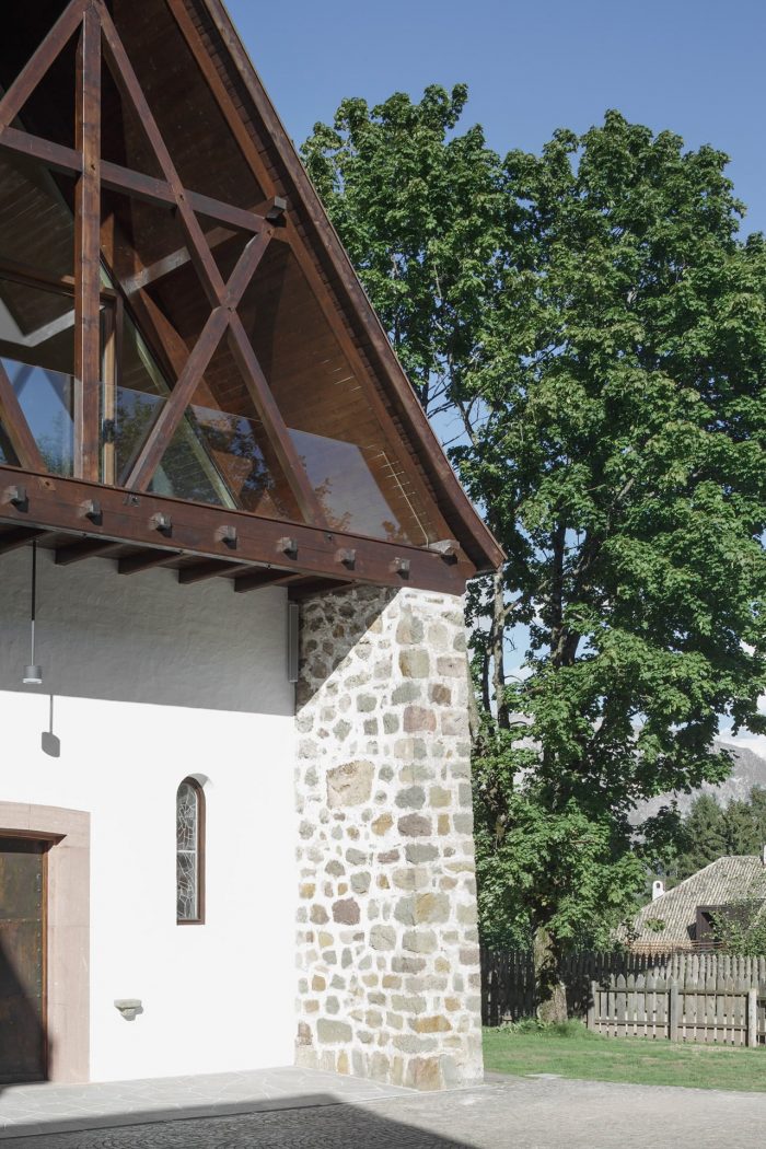 In the end only two architectural interventions determine the conversion of the church in the wood. On one hand it is the breakthrough of the sacred space to the landscape, on the other hand it is the opening of the gable to the piazza. Both interventions trigger off a dialogue between inside and outside, in other words between the man-made and the grown.