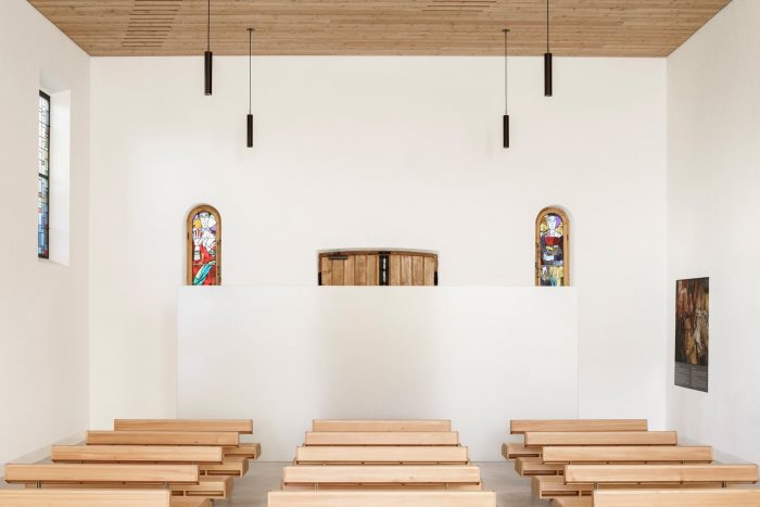 The east facade of the building was broken through to provide the church interior with more daylight. The huge rectangular opening behind the presbytery bathes the interior in light and underlines the pursuit of linking inside to outside, in a way spiritual to profane. The fleeting glimpse inside is claiming people’s attention and stimulating to enter the church.