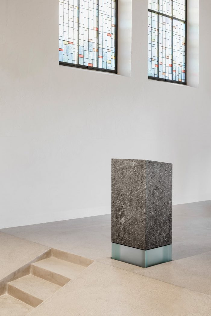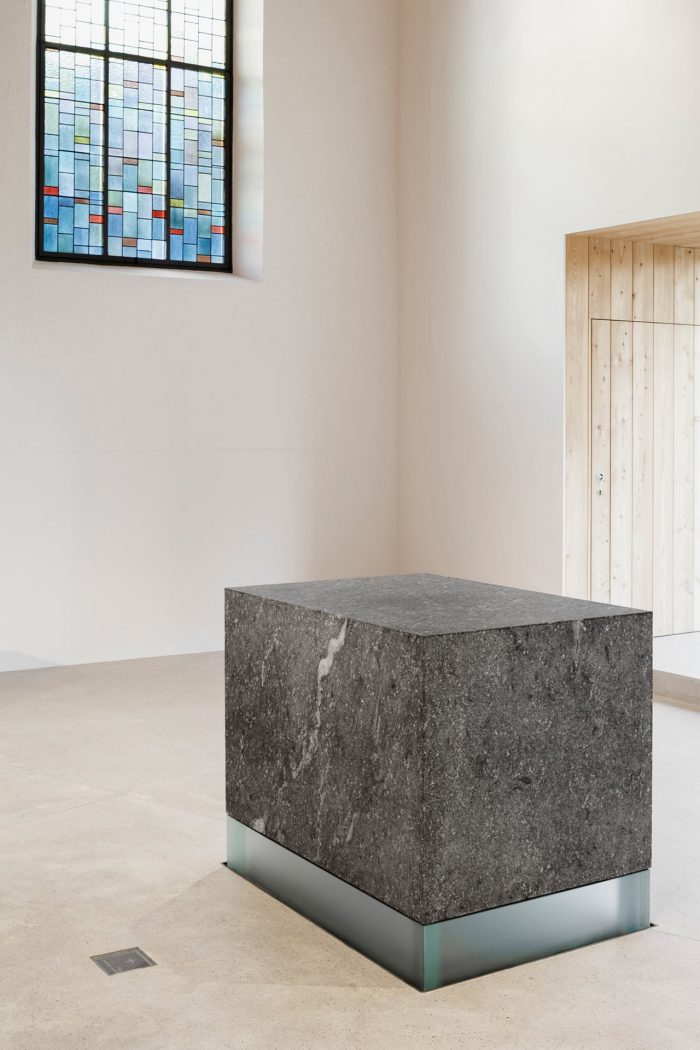 The reconfiguration of the prebytery originates with the recently passed away artist Franz Messner. Solid monoliths of a local variety of gneissic rock rest on the translucent glass bases. The light breaks through the fragile bases and makes the heavy masses hover above the ground. The weightlessness of the design strongly expresses the aspiration for the divine and the closeness to heaven.