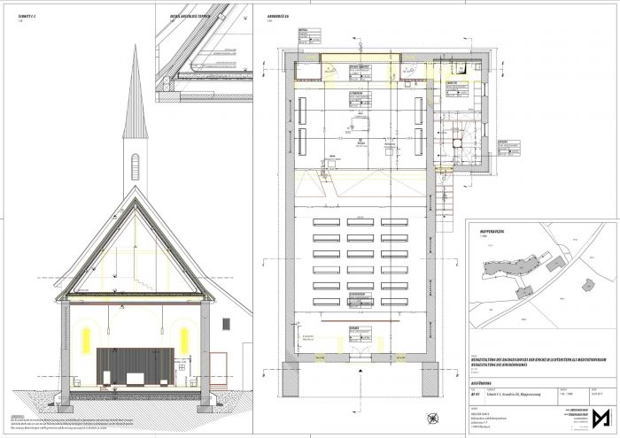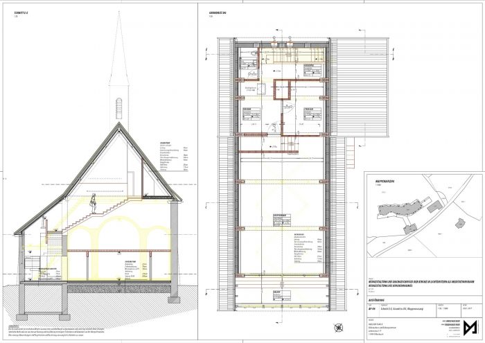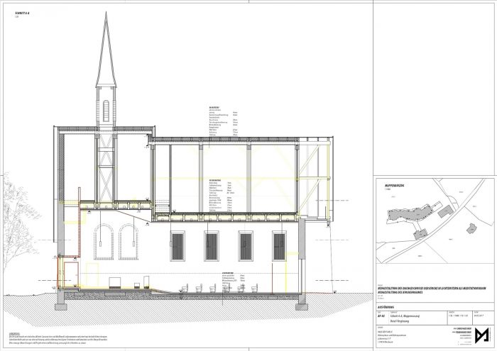 In the course of the conversion the previously unused attic floor was restructured and recovered as a place for meditation, silence and retreat. The attic floor consists in an entrance area with a cloakroom, a restroom, a storage room and a spacious event room.