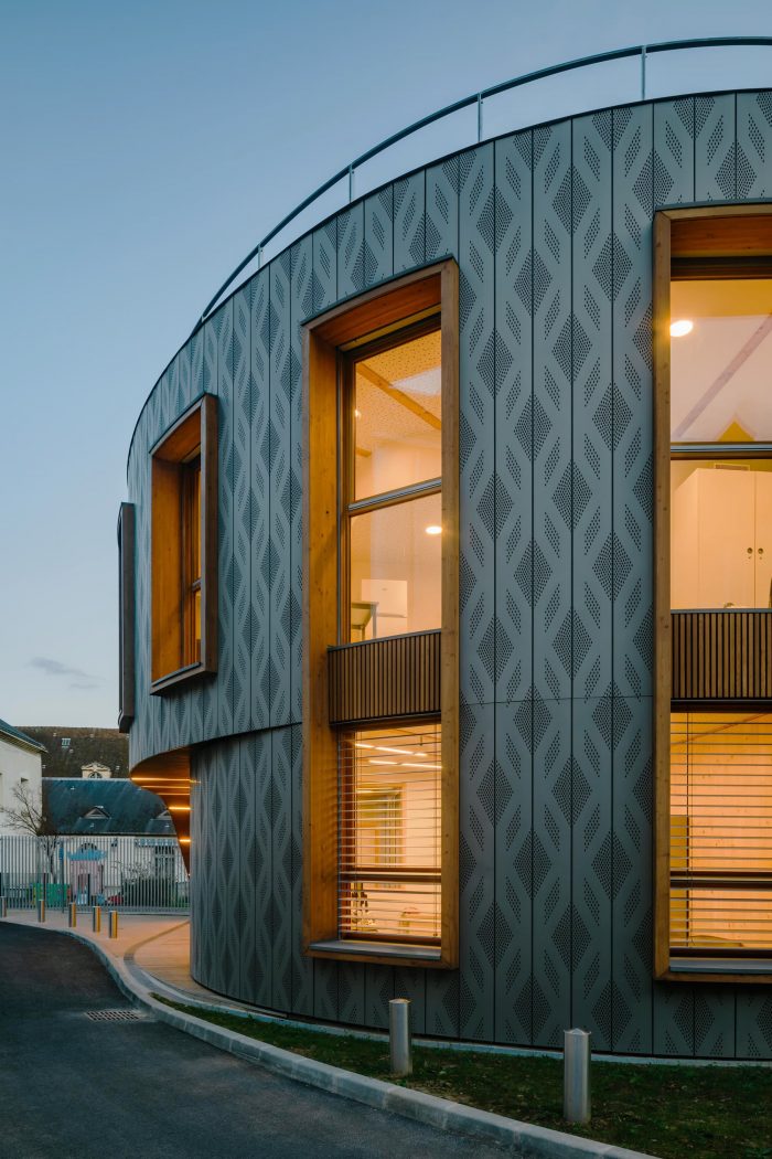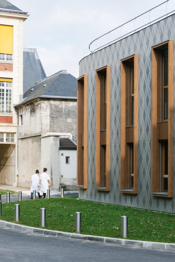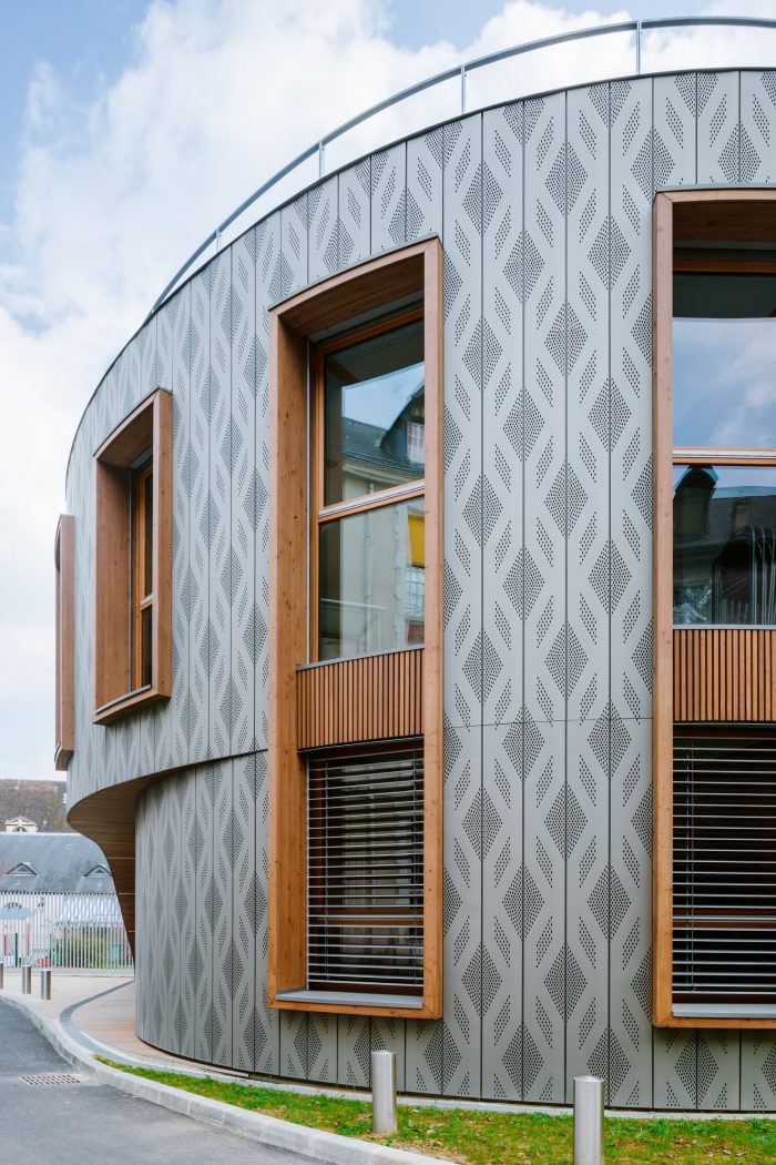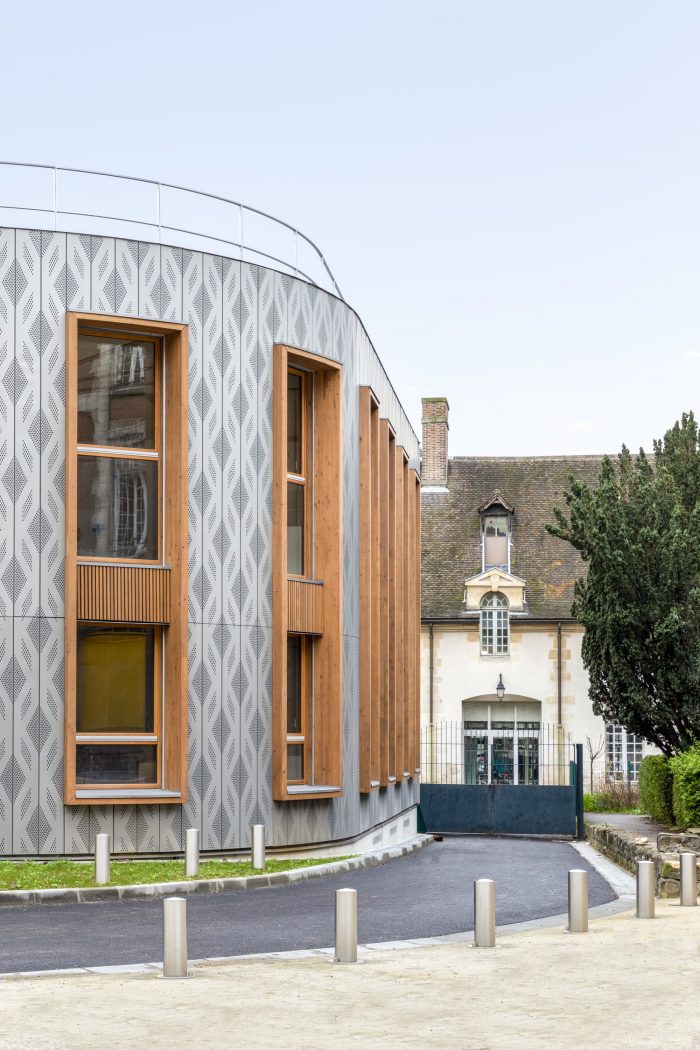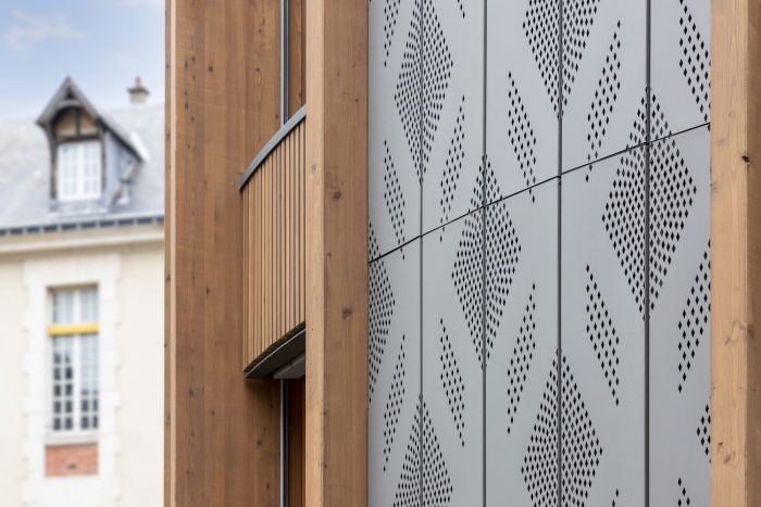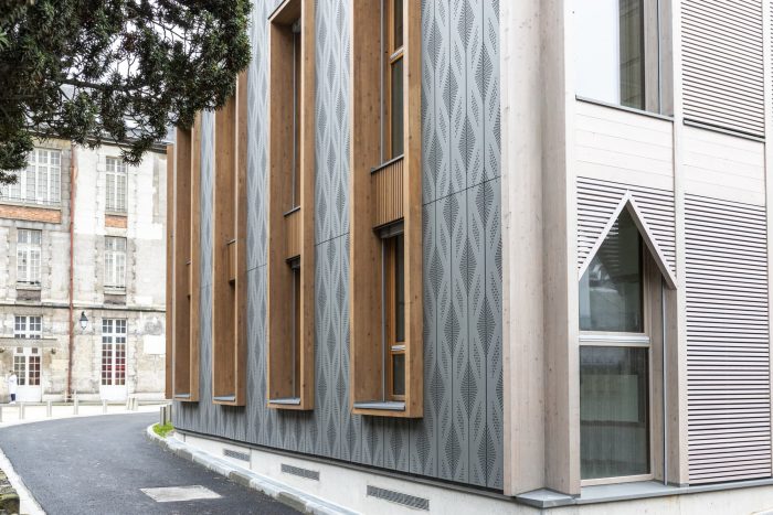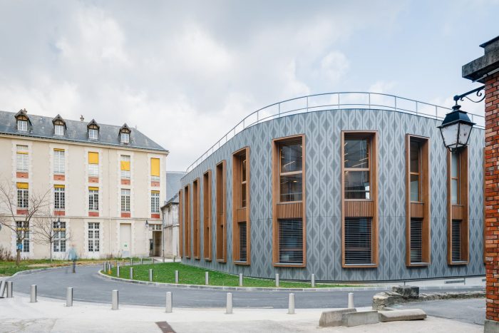 Different faces characterize the building: The first face of the building, connected to public space, is covered with pre-weathered zinc cladding for better integration in the Parisian environment. This cladding plays the role of a protective envelope. It brings a contemporary note with a perforated pattern that takes inspiration from the windows of the Saint-Louis chapel next to the plot. The double-height windows with wooden frames reinterpret the front building’s windows and help to minimize the scale of the building, thanks to the mesh pattern.