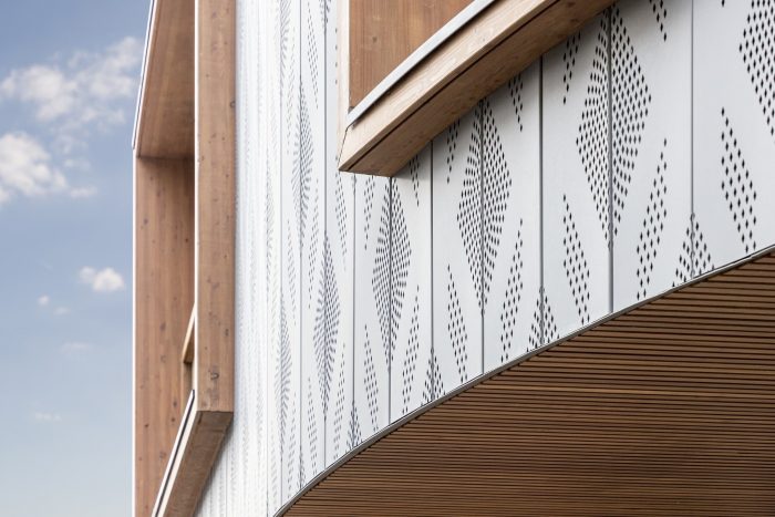 The second face is hidden from outside view and opens toward a protected garden of an existing kindergarten. Its treatment contrasts with the rest of the building: more transparent and permeable, creating a direct relationship with the shared garden, it brings the light go through the children’s spaces. The glazed façade reveals also the timber structures of the building (glulam posts and beams) and frame modules. The setback on the first floor creates an outdoor terrace partially covered.