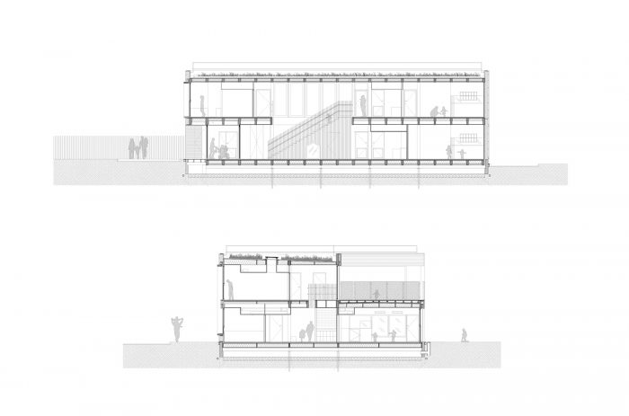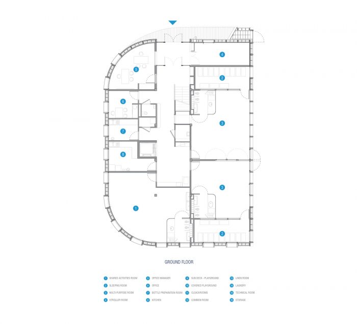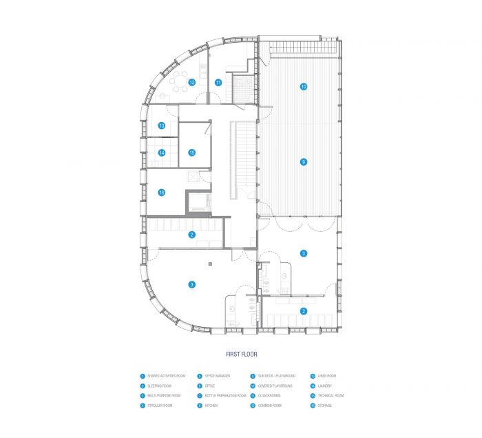 The project’s spatial organization revolves around a central indoor street straight in the axis of the main access connecting the two floors, each one hosting a daycare unit. This wide circulation allows punctual activities when extra space is needed. It serves, on the west side in connection with the zinc façade, offices, staff spaces as well as the technical parts. On the other side, it gives access to the spaces dedicated to children opening onto the garden. Upstairs it also gives access to the terrace.
