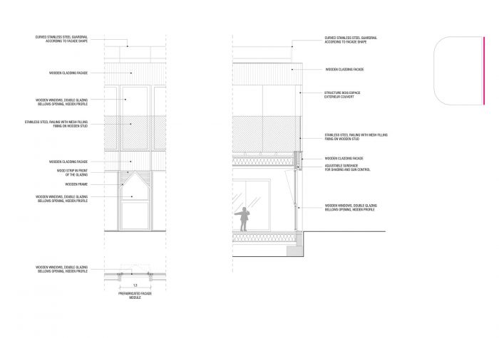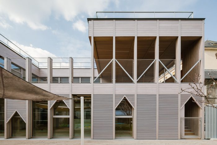 The kindergarten takes place in Saint Louis’s hospital in the 10th district of Paris. Located in a heritage area, the project is established on a 350m2 plot, next to an existing kindergarten for hospital staff with a garden that will be shared between the two structures and will host 48 cribs. As the city of Paris requested the building to be dismountable, the architects have opted for dry construction methods and prefabricated wooden structures and dismountable assemblies, allowing a possible deconstruction and future reuse of the building on another site.