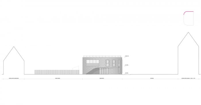 The proposed plot for the project delimited by a curved road and an existing garden defines the shape of the building.