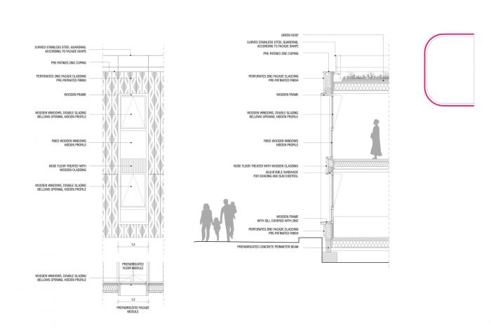 建筑物有不同的表面特征: 建筑物的第一面与公共空间相连,覆盖着预先风化的锌层,以便更好地融入巴黎的环境。这种覆盖层起到了保护性的作用。它的穿孔图案带来了现代气息,从地块旁边的圣路易小教堂的窗户中获得了灵感。带有木质框架的双层窗户重新诠释了前面建筑的窗户,并且由于网状图案的存在,有助于将建筑的规模降到最低。