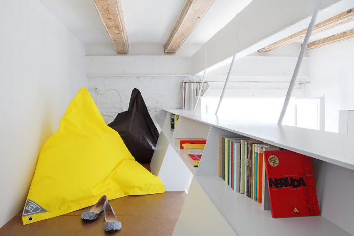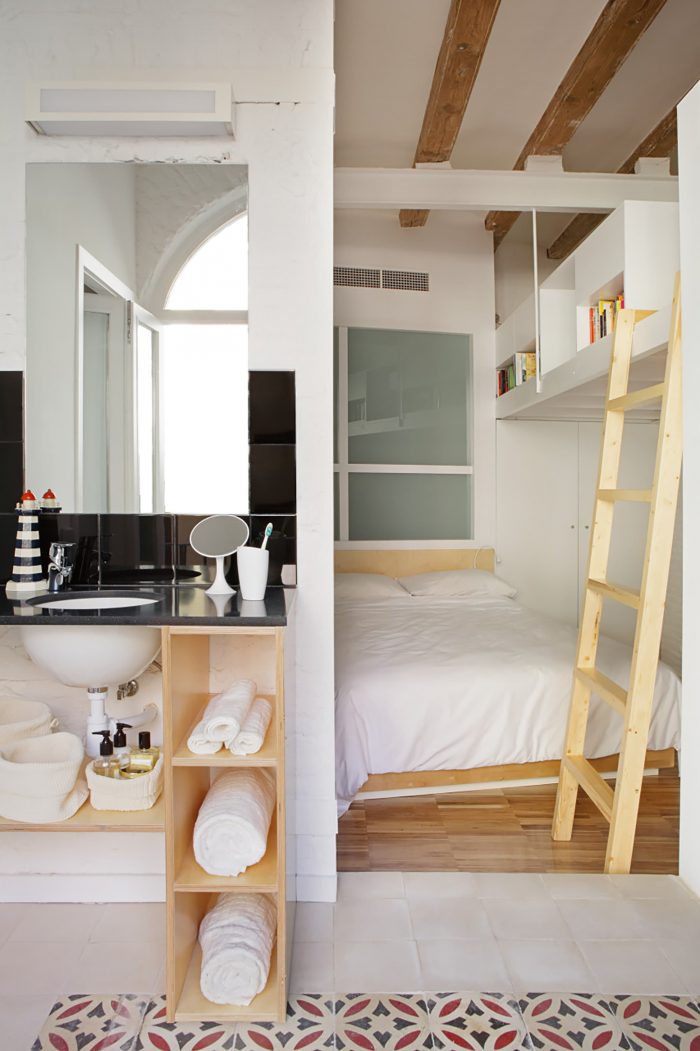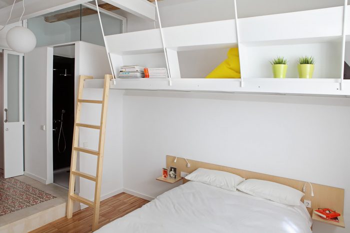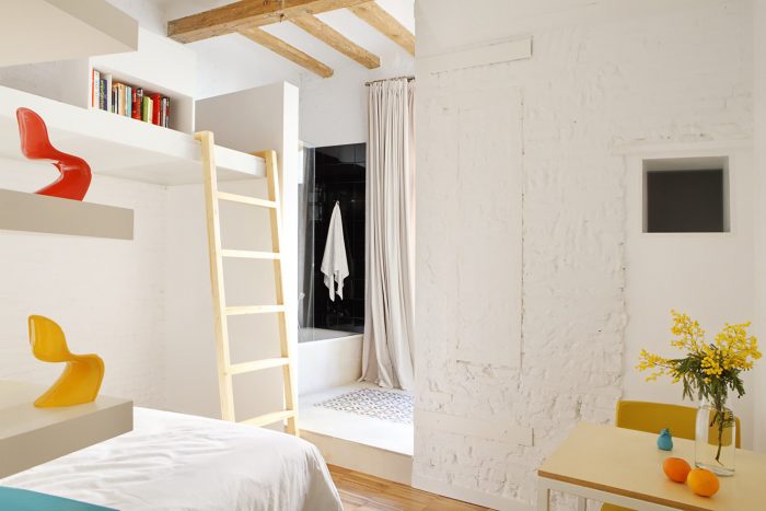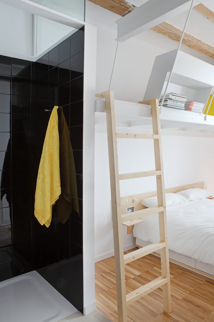 前提是:隐私的平衡。在白天,每个居民都可以封闭和保护他们的空间,而不阻挡自然光的穿越。而在晚上,双方都可以通过滑动实心门来隔离和保护单元。 3.40米的高度将能量输送到上层,两个多功能夹层悬浮在床的上方。将自然光引入淋浴间,也许还有从上面看过来的奇怪的目光。