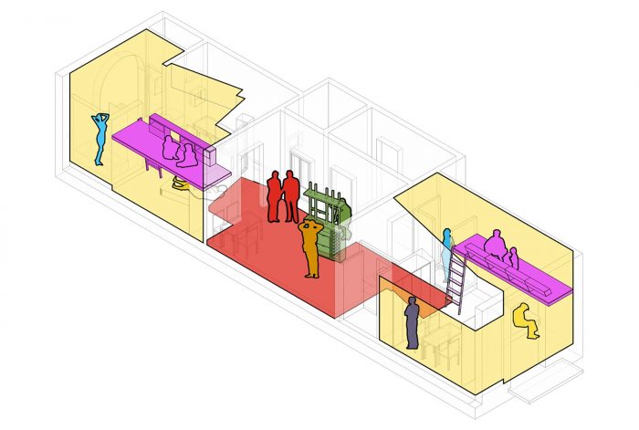 Salva46 is our investigation into flexible co-existence.Exploring the nomadic lifestyle of the 21st century. Where movement and fluidity contrast with privacy and stability. An experiment in shared micro living - two equally balanced spaces pivoted by a central communal area. A play of opposites in a world of conformists.