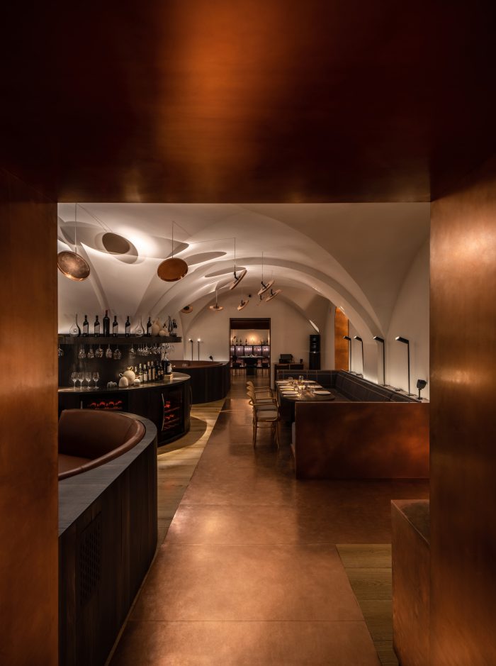 在餐厅的内部,有很多的铜。它强调了这里的高贵,并与吧台岛、控制台桌、柜台上方用钢绳悬挂着玻璃杯的架子等简洁的造型形成了令人印象深刻的对比。