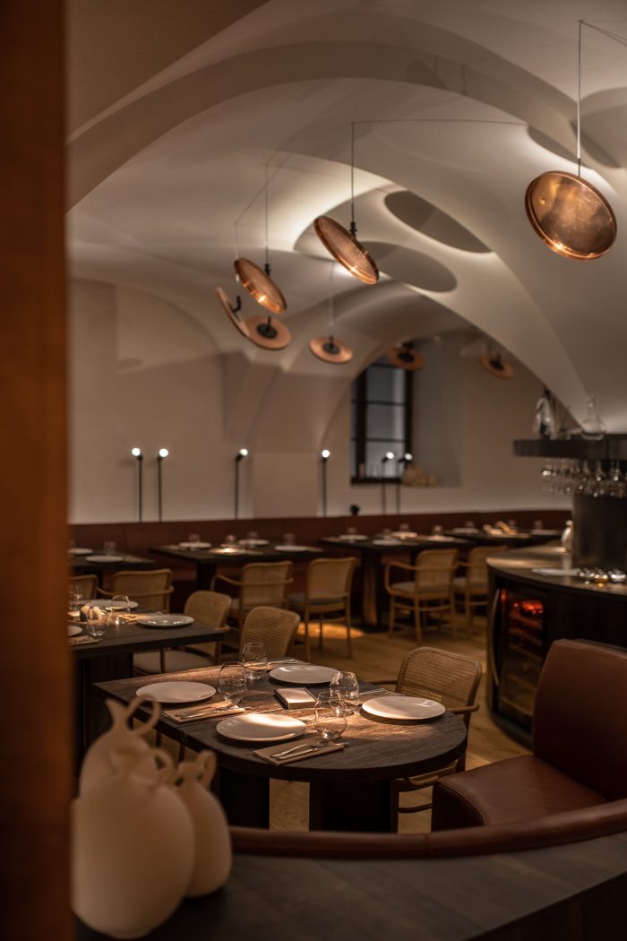 The restaurant has 5 halls and about 120 seats. Guests start their journey in the hall with a welcome bar where aperitives are served, then they go to one of three main halls with set tables. After the meal, they could hang out in a hall with a copper bridge, a DJ on the balcony, and bar mixology. It is a perfect place for communication and seeping into the vibrant atmosphere of Samna.