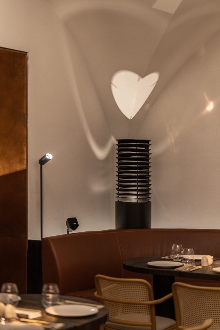 铜色的柔和色调也出现在餐厅的照明中。射灯的条纹从悬挂在天花板下的铜板上反射出来,照射到桌子上。这样的灯光结构,提供了一种丰富而温暖的光束效果,照亮了最舒适的空间,也不会遮住客人的眼睛。