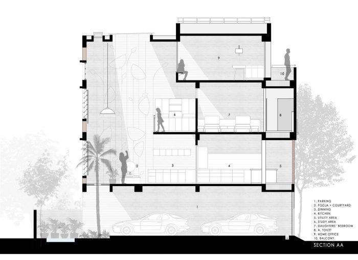 由于这是一块190平方米的小块土地,需要容纳大约10个不同的空间功能,建筑的占地面积必须最大化。虽然地块大小的限制清楚地表明,平房将上升到四层,但要保留其简陋的规模和阻止低层公寓的外观是一个挑战。更重要的是,要在住宅中整合一个双层高的庭院,作为自然光和空气的来源,并使其成为一个有凝聚力的家庭空间,这是一个相当大的挑战。根据客户的要求,所有的服务设施都必须放置在正面(入口),最终使建筑师希望实现的视觉和体验的联系变得复杂。