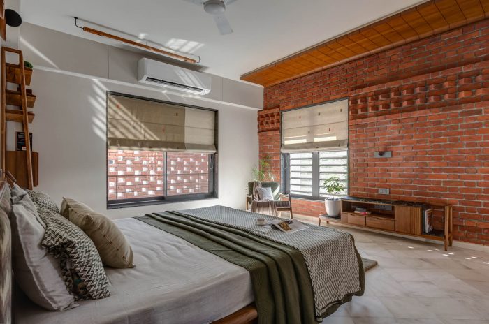 The use of Indian white stone flooring gives a traditional as we as modern feel owing to its textures and colors. Brick being such an important part of elevation also plays an important role in shaping a number of interior elements such as door handles and louvers. The huge ventilated Northern facade of the courtyard has a resolved mechanical system to make it efficiently operable. This large window system with glass multiple louvers is operated through hand gear having a bevel gear and fork-swivel opener technique.