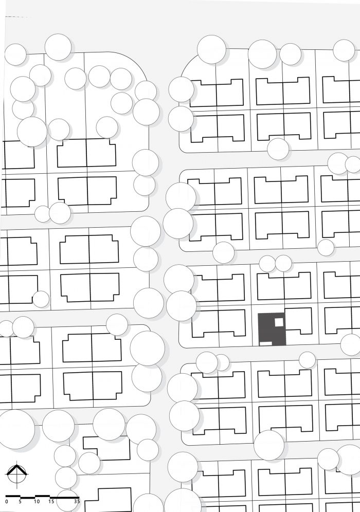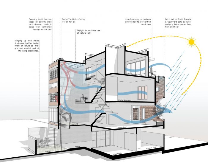 Opening up to outside and bringing the tree inside the house signifies the design intent of integrating nature as an indispensable part of the living experience. A very simplistic material palette of Brick and exposed Concrete is explored in the truest of its spirit to address the structural, climatic as well as aesthetic needs of this humble abode. Albeit a conventional palate, it is played around by exploring variations in forms and surfaces such that they become an aesthetical canvas for inside as well as outside. One and a half brick Flemish bond was one such conscious decision to achieve passive cooling through its cavity as well as thickness.