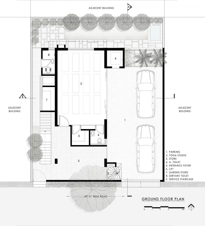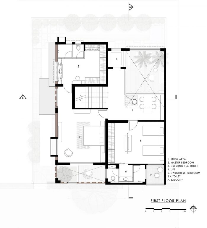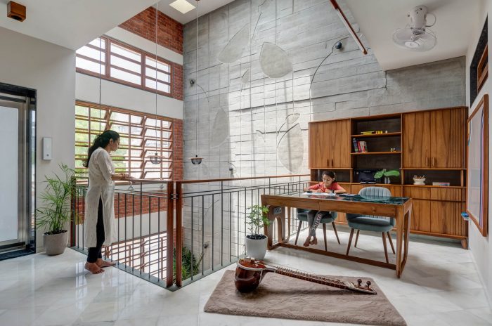 The spatial configuration revolves around the idea of placing functional spaces around the Courtyard aiming to extend their physical and visual association across three stories. The arrangement also prioritizes privacy as a concern in arranging private and semi-private spaces around the court The Open-to-sky courtyard is strategically positioned on the North-East side connecting the Living space, Dining space, Pooja space on the Higher Ground Floor and study area & home office on the upper floors. Considering norms of ‘Vastushastra’, Kitchen and living room are placed on the Southern side of the bungalow with a buffer space with utilitarian activities. This created buffer is enveloped with a Brick Screen offering desired privacy, ventilation as well as passive cooling for the Southern facade.