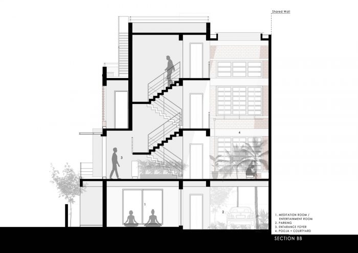 Since it’s a small piece of land of 190 Sq.Mt. with requirements spanning to accommodate around 10 different spatial functions, the building footprint had to be maximized. While the limitation of plot size clearly indicated that the bungalow would rise up to four stories, it was a challenge to retain its humble scale and discouraging an outlook of a low-rise apartment. All the more, it was quite challenging to integrate a double-height courtyard in the residence, as a source of Natural light and air, along with it being a cohesive family space. Vastu compliance being the client’s primary insistence, all the services had to be placed on the front (entry) side, eventually, complicating the visual and experiential connections that an architect desires to achieve.
