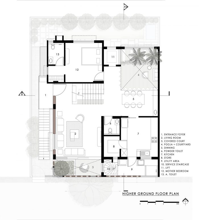 空间配置围绕着将功能空间放在庭院周围的想法,旨在将它们的物理和视觉联系延伸到三层楼。该安排也优先考虑隐私问题,在庭院周围安排私人和半私人空间。开阔的庭院被战略性地安置在东北侧,连接起居空间、餐饮空间、较高一层的Pooja空间以及高层的学习区和家庭办公室。考虑到 "Vastushastra "的规范,厨房和起居室被放置在平房的南侧,有一个功利性活动的缓冲空间。这个创造出来的缓冲区被一个砖砌屏风所包围,提供了所需的隐私、通风以及南部外墙的被动冷却。