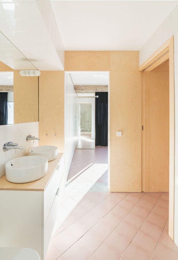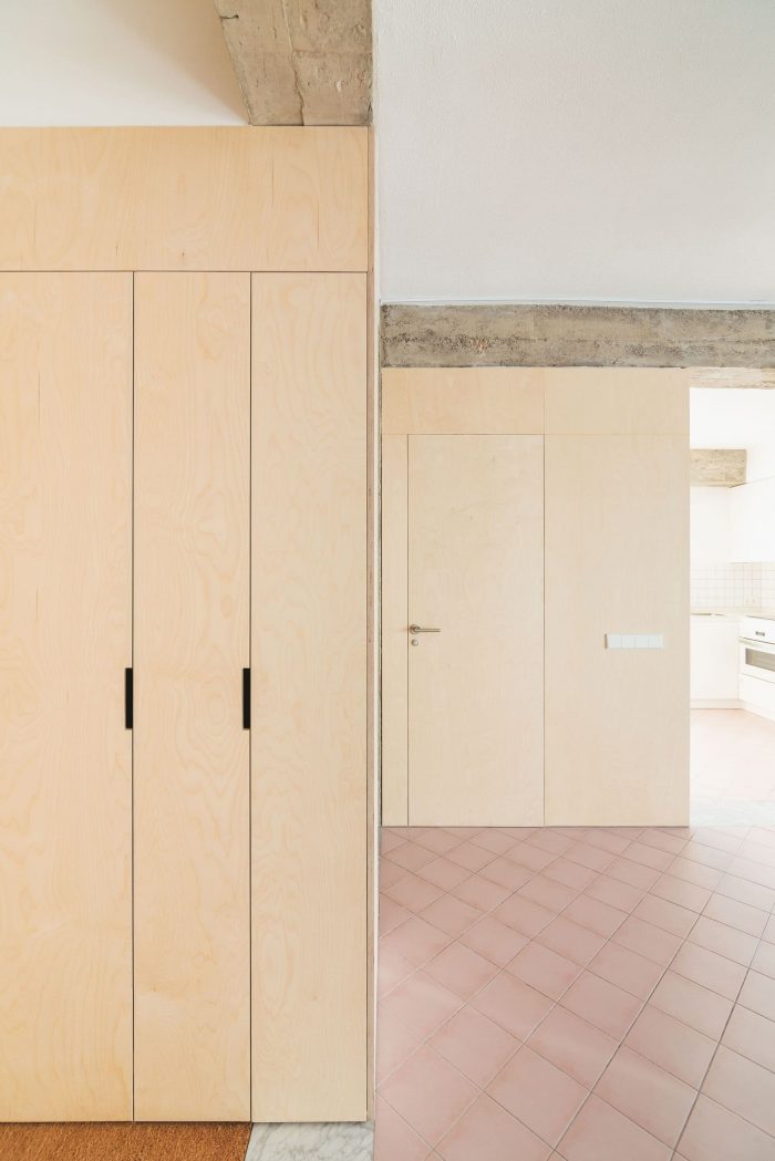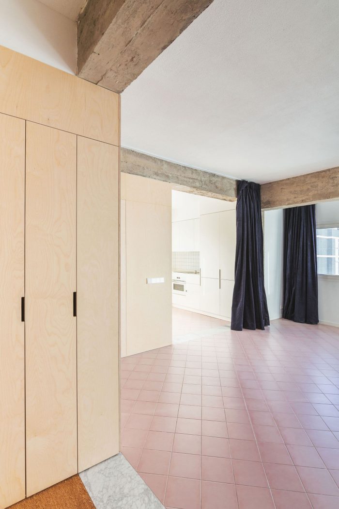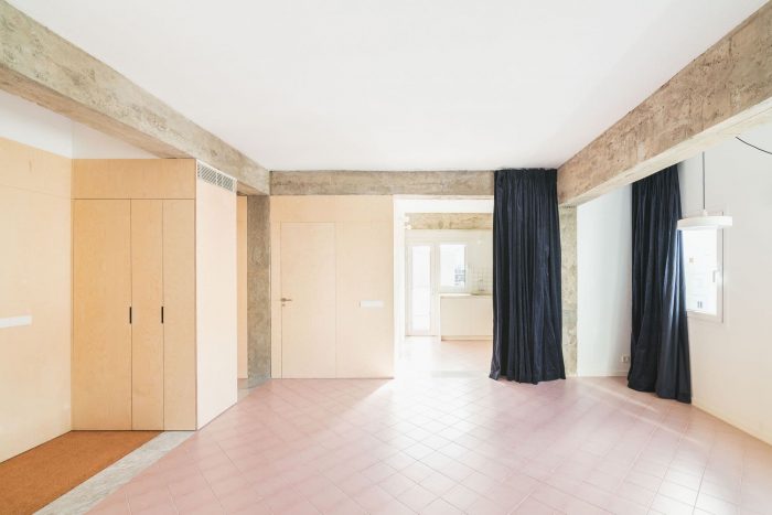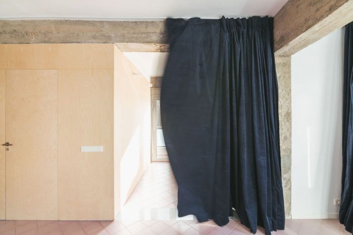 A 20x20 cm hydraulic pavement has been chosen, placed at 45º, reminiscent of the floors of popular housing in the neighborhood. In addition, some Carrara marble bands are added that reproduce the structural scheme of the hanging beams and mark the transition between the different uses. Finally, blue velvet curtains were incorporated that allow the rooms to be darkened or made independent, offering a theatrical aspect to the whole. A very limited intervention in dimensions and budget, which tries to create a pleasant and warm place in which to live from simplicity.