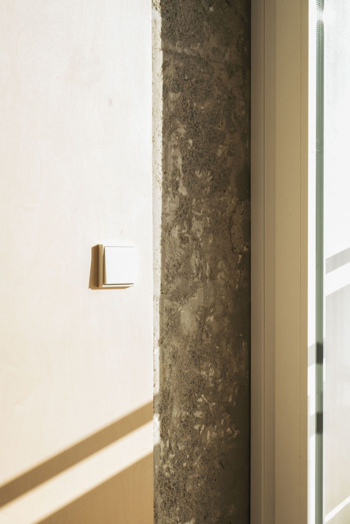 在分析阶段,我们发现了一些仍然隐藏在覆层和橱柜中的混凝土吊梁。它们的存在,使我们不仅选择了展示它们的无遮蔽性,而且它们还帮助构建了房子的新组织。桦木的连续包层将私人区域与公共区域区分开来,并允许我们用同样的材料来解决通道门和存储空间。