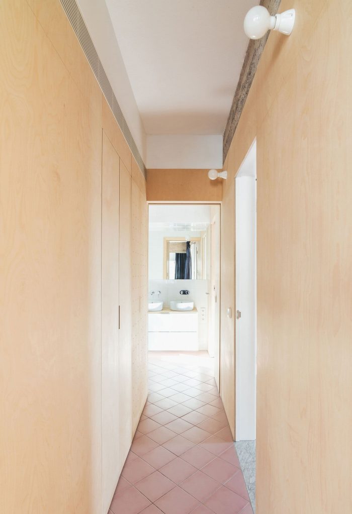 During the analysis phase, we discovered some concrete hanging beams that remained hidden in cladding and cabinets. Their presence was such that we chose not only to show them devoid of coverings, but they helped to structure the new organization of the house. A continuous cladding of birch wood differentiates the private areas from the common ones and allows us to solve the access doors and storage spaces with the same material.