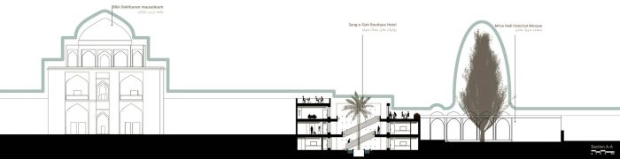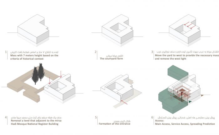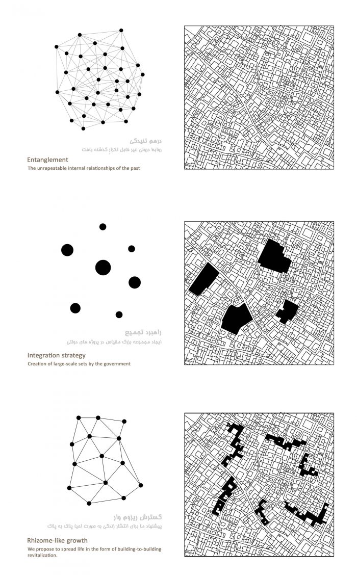 This project is an attempt to experience rehabilitation and provide a way to spread it in the historical context so that it changes the social and cultural structure and generates the new life. But the main problem in rehabilitation of historical context is to deal with the pseudo-historical patterns desired by decision-making organization that are trying to make an imitation of the original with codes and ornaments which are familiar to our eyes. We tried not to involve the project in common codes and motifs to propose a strategy for spreading block to block of life into the context in the direction of rehabilitation of historical context.