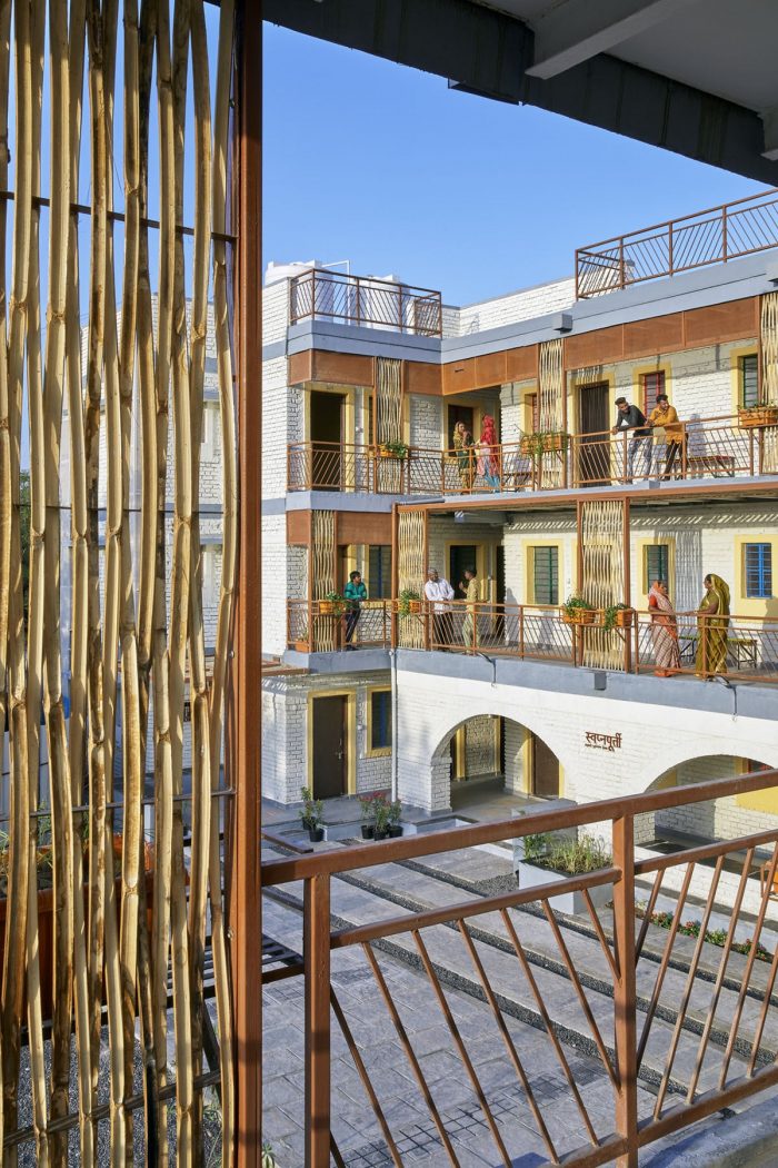 In addition to design, the project has also focused on the quality of construction, keeping in mind the local soil (black cotton) and weather conditions. The building has load-bearing, reinforced masonry walls, with a vernacular plank and joist slab system. Elements such as bamboo screens and pergolas have been added as shading devices throughout the building. The wide corridors have been designed to have common spaces for social interactions, as well as for natural lighting and adequate ventilation throughout.
