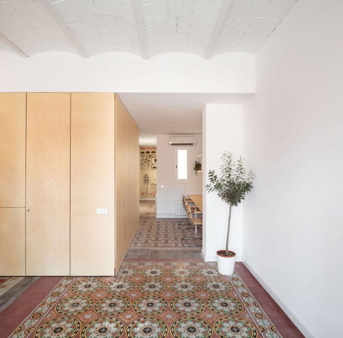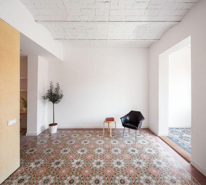 This typical dwelling in the Ensanche Cerdà district of Barcelona had already been renovated, eliminating all the original woodwork, and the floor was covered with a glued cork carpet.