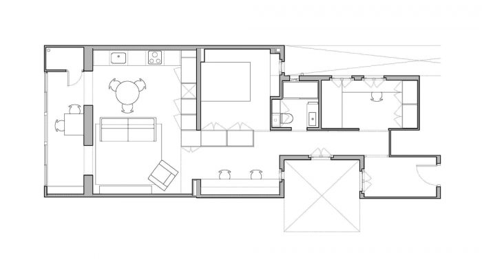 尽管有可能找到损坏的碎片,但还是决定恢复原有的液压马赛克地板,并选择了一个更加开放的布局,厨房-餐厅的光线从街区天井照射进来,并寻找对角线的视野,使之在视觉上扩大空间的可能性。