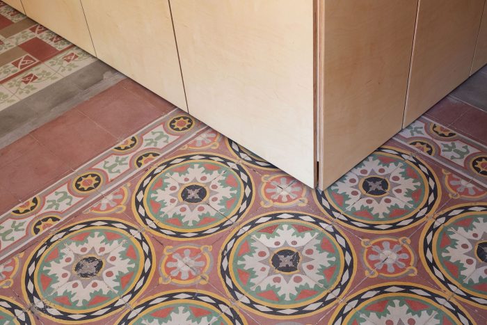 Despite the possible risk of finding damaged pieces, it was decided to recover the pre-existing hydraulic mosaic floor and a much more open plan layout was chosen, with a kitchen-dining room flooded with light from the block patio and looking for diagonal views that would make it possible to visually enlarge the space.