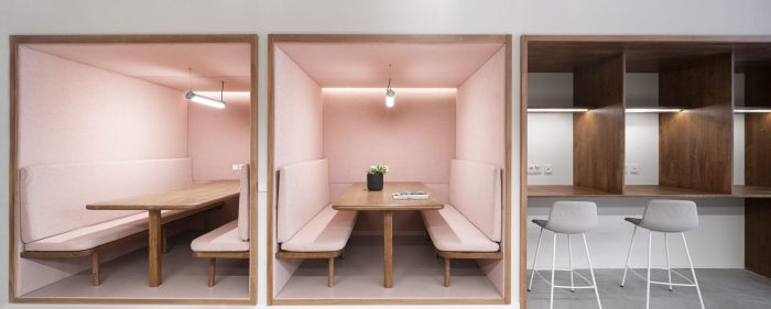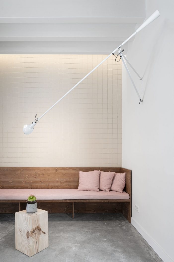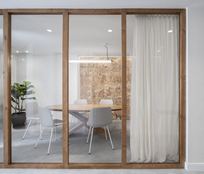 The program accommodates an open space with a bespoke wood reception desk, comfortable focus booths, thinking desks, as well as an independent meeting room, an extra work room, and a chill area connected to the patio. Materiality assumes a leading role. The use of local materials balances neutrality with uniqueness, while the addition of colorful elements adds a contemporary feel to the space. In the main workspace, the recovered local marès wall harmoniously plays with the softness of the timber custom-made furniture and the cushioned booths.