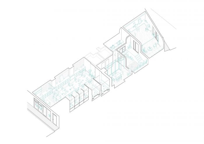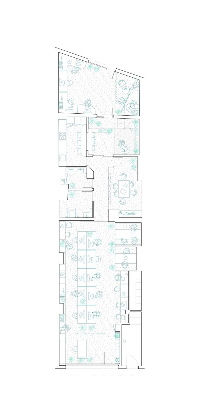 圣马吉协同工作。办公设施横跨建筑的宽度,同时向街道和后面的室内庭院开放。这个横向体量的慷慨是通过努力开放这些以前封闭的空间而实现的。整体操作被室内和室外的植被所点缀,创造了不同程度的隐私。为满足用户的需求,提供了多种工作方案。