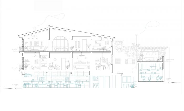 COWORKING SANT MAGÌ. Coworking facilities span the width of the building and open simultaneously to the street and to an indoor patio at the back. The generosity of this transversal volume is accomplished by an effort to open these formerly closed-up spaces. The overall operation is punctuated with indoor and outdoor vegetation that creates varying degrees of privacy. A variety of working options are available to meet the needs of users.