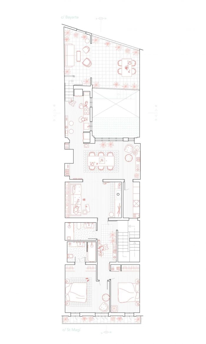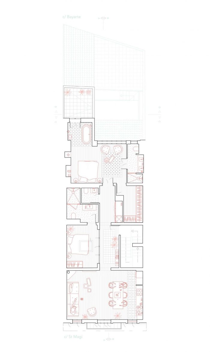 HOUSING SANT MAGÌ. In order to enhance the traditional morphology of the local heritage, each domestic space occupies an entire floor. Although they share similar characteristics, the apartments display a different programmatic approach toward the building’s intimacy. First-floor common areas are organized towards the back of the plot, facing the patio for peace and quiet. In contrast, the second-floor apartment common spaces face the main street of Sant Magì, while the suite overlooks the patio.