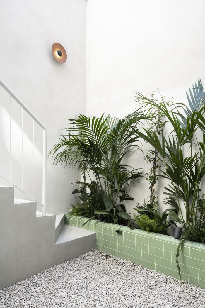 Cherishing the island’s style, the flats are designed with simplicity: Its bespoke special features are what sets them apart from one another. Located on the first floor, the living area of the first flat accommodates a custom-designed fireplace. On the second floor, you can find a central guest room with an arched steel frame and a glass wall that gives the space a refined atmosphere. The outdoor terraces looking towards the patio create an oasis in the center of the city. It is a unique space to relax and enjoy the lovely Mediterranean weather. Responding to aesthetic and programmatic purposes, the patio opens up to the sky and allows the building to naturally cool during summer.