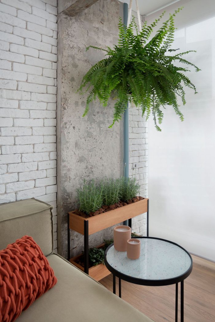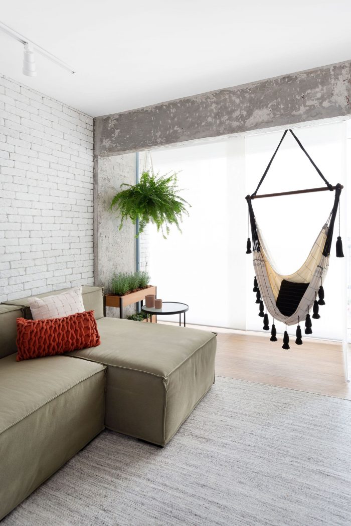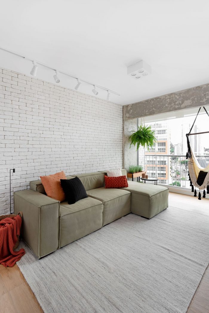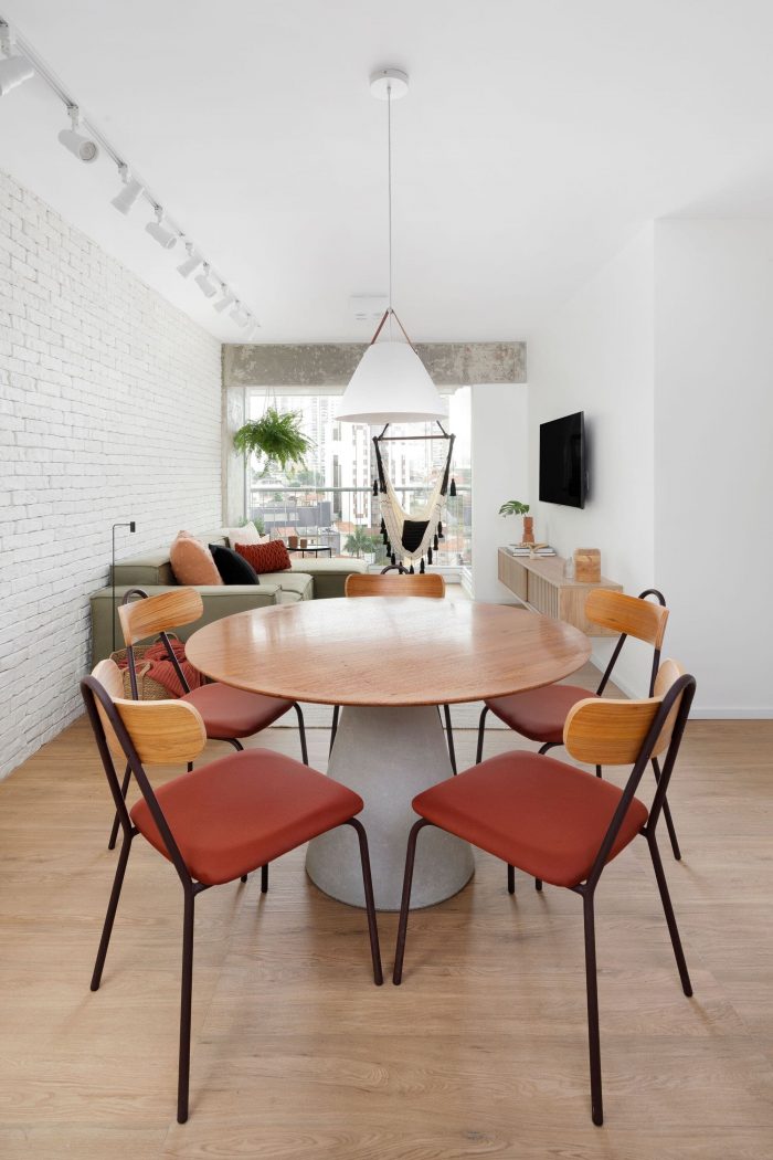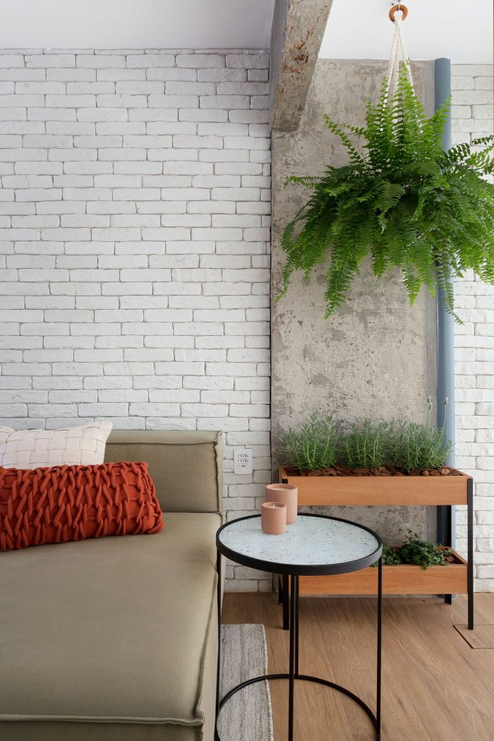 Na decoração, encontram-se inspirações boho, rústica e contemporânea, com demarcações nas cores branco, verde, ferrugem e terracota. Entre os materiais, madeira, concreto e tijolinho complementam o conceito – além do uso de linhas retas. O design da marcenaria ganhou seu protagonismo e formulou recursos para setorizar, organizar e obter um melhor aproveitamento dos espaços.