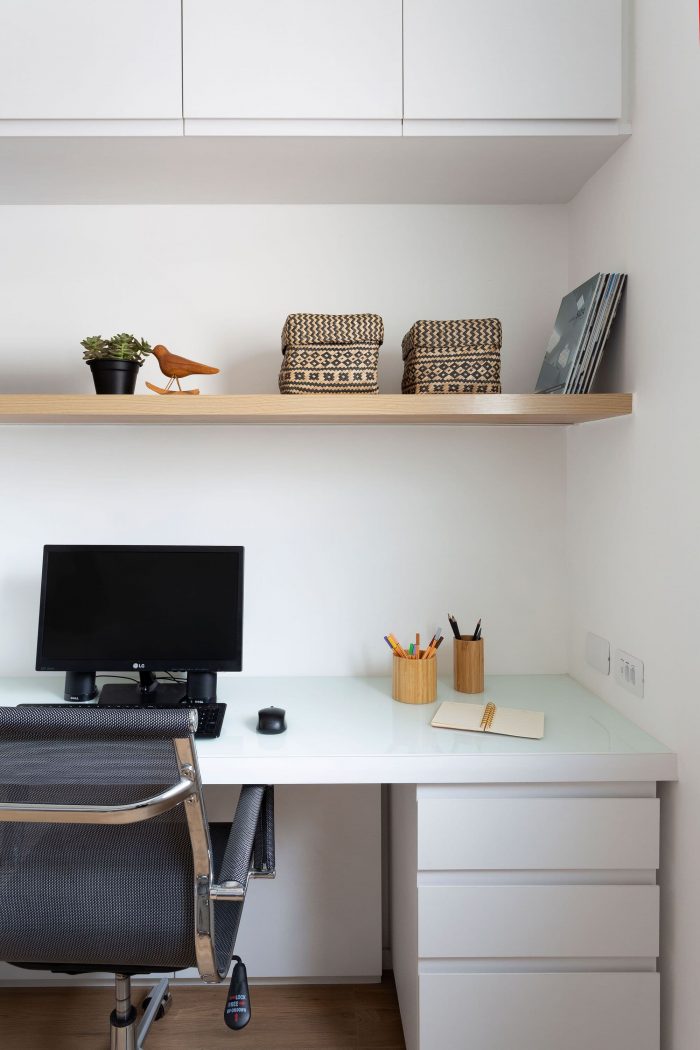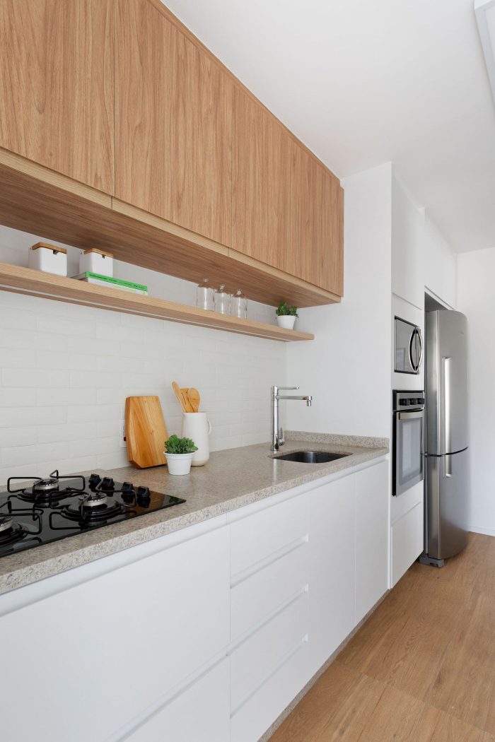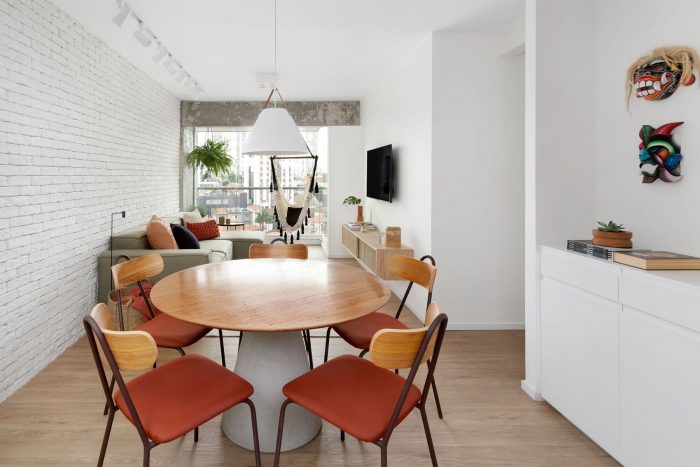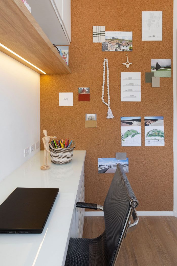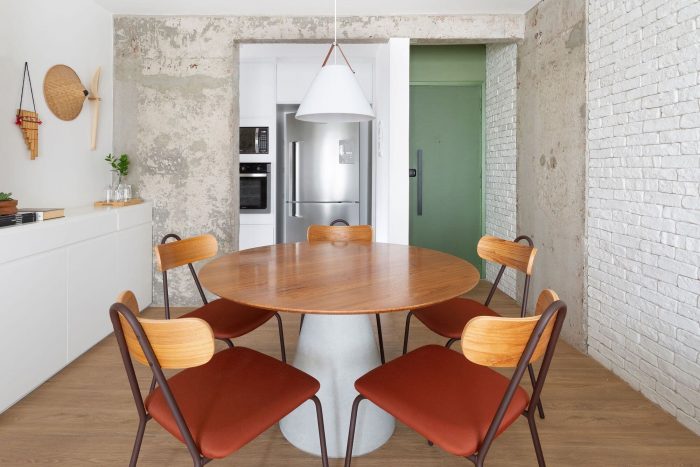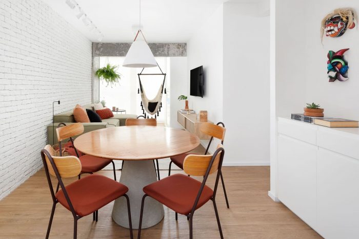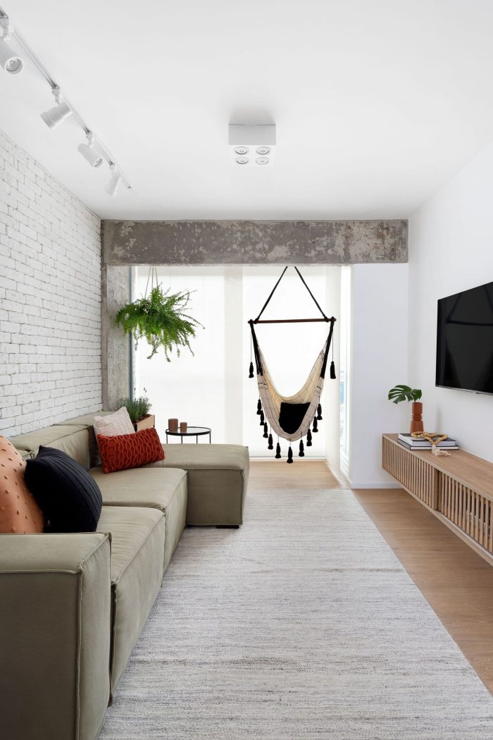 Na decoração, encontram-se inspirações boho, rústica e contemporânea, com demarcações nas cores branco, verde, ferrugem e terracota. Entre os materiais, madeira, concreto e tijolinho complementam o conceito – além do uso de linhas retas. O design da marcenaria ganhou seu protagonismo e formulou recursos para setorizar, organizar e obter um melhor aproveitamento dos espaços.