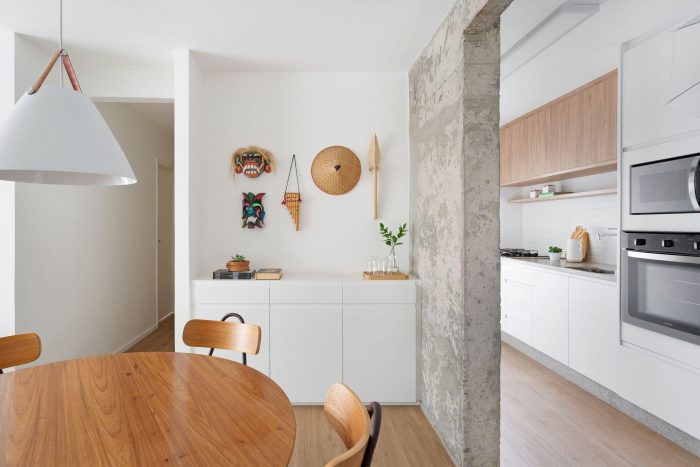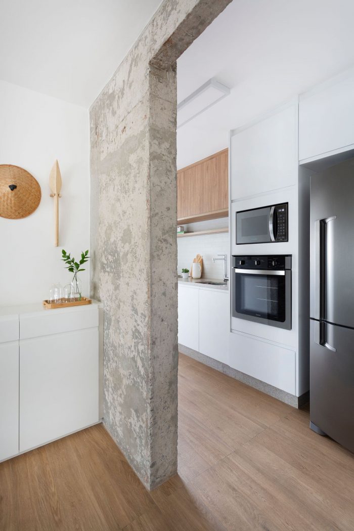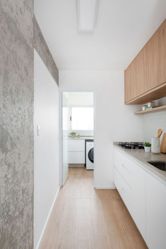 Em termos estruturais, a integração foi prioridade. Com a remoção da porta de vidro e demolição da parede, a varanda foi integrada à sala, assim como a cozinha, com a retirada da porta e parte de uma parede. A cozinha, por sua vez, ganhou mais espaço para geladeira e torre de fornos com a retirada da porta de entrada de serviço através da instalação de uma placa de drywall. Com as mudanças, ventilação cruzada e iluminação natural foram evidenciadas no apartamento. Na área de serviço, foi instalado sistema de aquecimento de água.