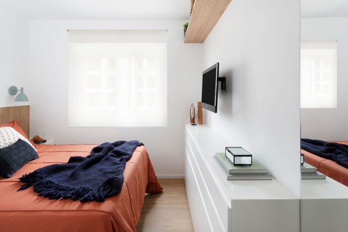 在结构方面,整合是一个优先事项。随着玻璃门的拆除和墙体的拆除,阳台与客厅以及厨房融为一体,同时拆除了门和部分墙体。而厨房则通过安装干墙板拆除了服务入口的门,为冰箱和烤箱塔提供了更多空间。随着这些变化,公寓里的交叉通风和自然采光得到了证明。在服务区,安装了一个水加热系统。