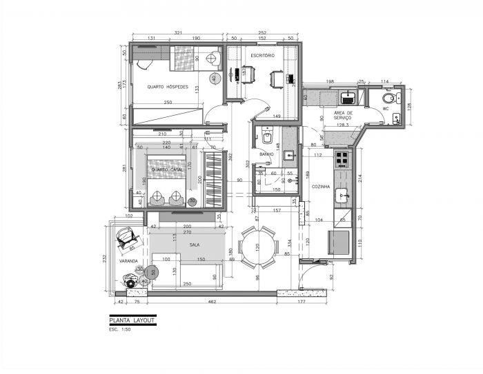 O projeto de iluminação é composto por luminárias de sobrepor em função do pé-direito baixo e, justamente por isso, a inviabilidade de instalar forro de gesso nos ambientes. Todas as lâmpadas são de led. O projeto, portanto, distribui-se em salas de jantar, estar e TV integradas, além de cozinha, área de serviço, lavabo, corredor, quarto de casal, banheiro e escritório.